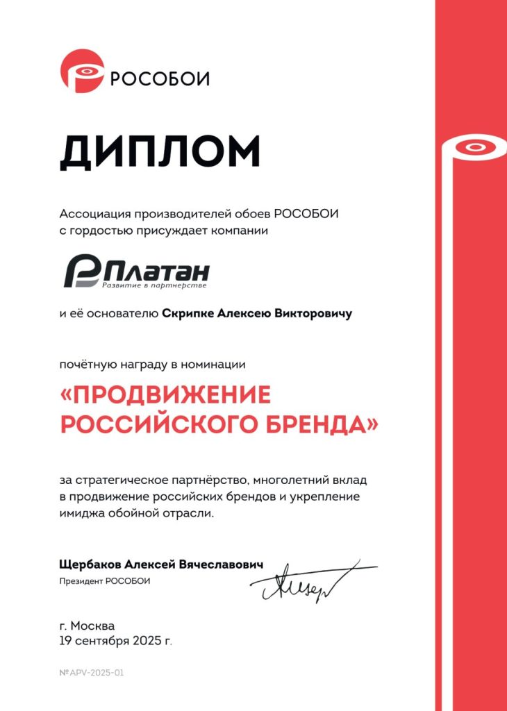 В рамках отраслевого «Семинара избранных», который прошел в Ялте, Ассоциация «Рособои» вручила компании «ПЛАТАН» и ее основателю Алексею Викторовичу Скрипке диплом за весомый вклад в продвижение российского бренда.